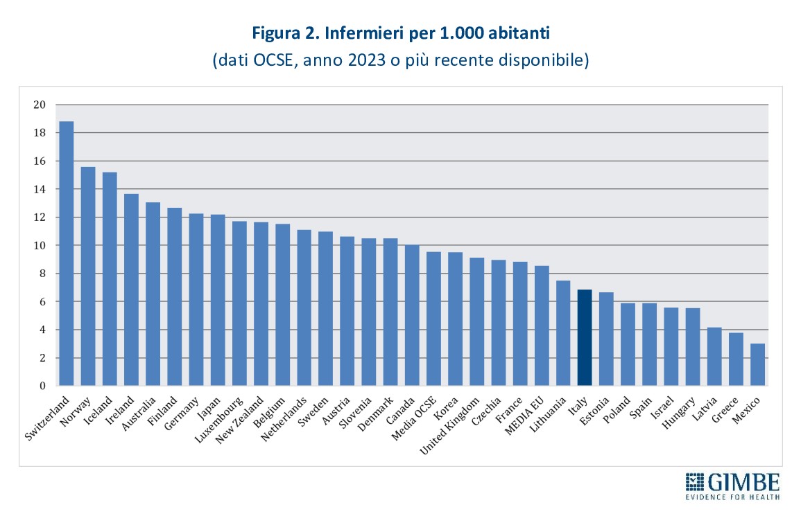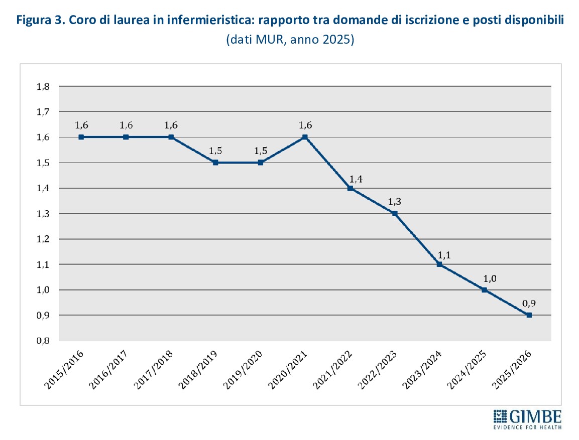 - La situazione più critica riguarda il personale infermieristico: l’Italia è al 23° posto su 31 paesi europei dell’area OCSE, con 6,9 infermieri per 1.000 abitanti (media OCSE 9,5) (figura 2). «Ma soprattutto – ha spiegato il Presidente – la professione non è più attrattiva e i laureati sono sempre meno: nell’anno accademico 2025-2026 il numero di domande di accesso ai corsi di laurea in infermieristica è stato addirittura inferiore a quello dei posti disponibili» (figura 3).