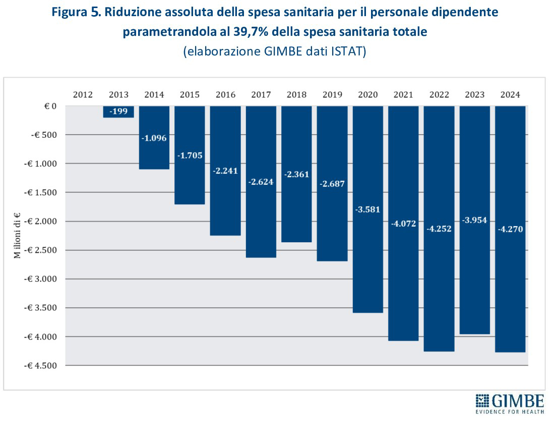IL NODO DELLE RISORSE: UNA RIFORMA SULLA CARTA. Nel corso dell’audizione, il Presidente ha documentato come, nel periodo 2012-2024, il capitolo di spesa per il personale sanitario sia stato notevolmente sacrificato. In termini percentuali, la quota destinata al personale dipendente e convenzionato è scesa dal 39,7% del 2012 al 36,6% del 2024 (figura 4). L’entità della riduzione emerge in tutta la sua gravità da una simulazione che ipotizza il mantenimento costante, nel periodo 2012-2024, della quota di spesa per il personale del 2012 (39,7%). In soli 12 anni il personale sanitario del SSN ha complessivamente “perso” € 33,04 miliardi, di cui € 12,82 miliardi nel solo periodo 2020-2024 (figura 5). «È del tutto evidente – ha commentato il Presidente – che un “saccheggio” di risorse pubbliche di tale portata ha progressivamente indebolito e demotivato il capitale umano del SSN, alimentando l’abbandono del servizio pubblico e la crescente disaffezione verso alcune professioni e specialità».