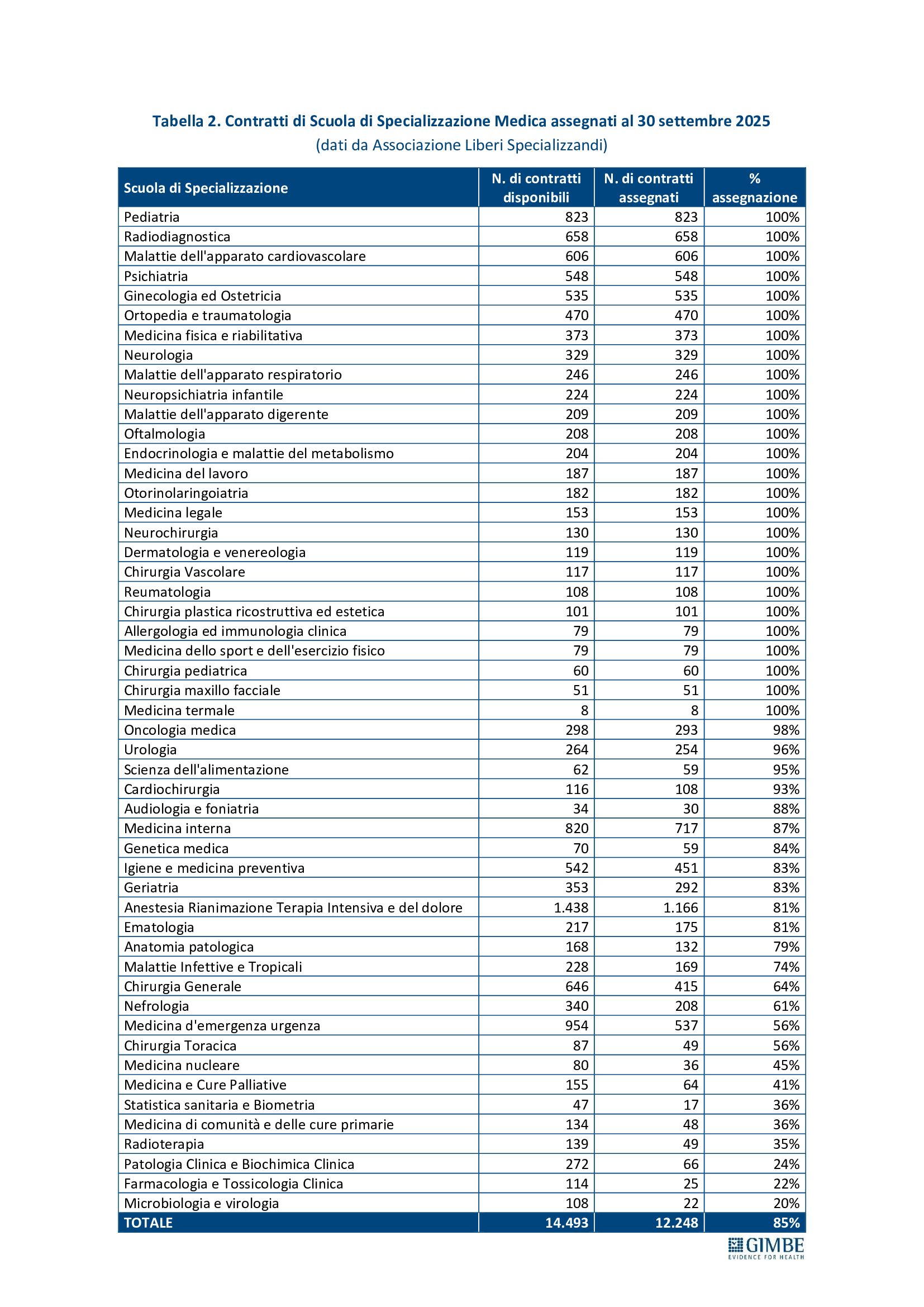 Carenze di medici nel SSN. «Il problema italiano – spiega Cartabellotta – non è rappresentato dalla mancanza di medici in termini assoluti, ma dal loro progressivo abbandono del SSN e da carenze selettive, perché sempre meno giovani scelgono la medicina generale e alcune specialità cruciali, ma poco attrattive». Per i medici di famiglia, sulla base dei dati SISAC, al 1° gennaio 2024 la Fondazione GIMBE stima una carenza di 5.575 MMG. Per i medici specialisti, la carenza può essere stimata solo analizzando i tassi di accettazione dei contratti di formazione specialistica. Nel concorso 2025-2026, a fronte di 14.493 contratti, ne sono stati assegnati 12.248 (85%), ma con tassi di assegnazione bassi o molto bassi in aree cruciali per il funzionamento del SSN: medicina d’emergenza-urgenza, chirurgia generale, medicina di comunità e delle cure primarie, radioterapia e tutte le specialità di laboratorio (tabella 2). «La soluzione per fronteggiare queste carenze selettive – chiosa Cartabellotta – non può certo essere quella di aumentare gli iscritti alle Facoltà di Medicina. Servono invece azioni mirate e interventi straordinari per restituire attrattività alla medicina generale e alle specialità disertate dai giovani medici».