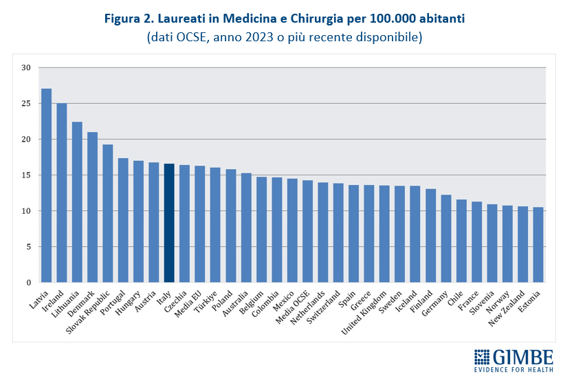 Confronti internazionali. Secondo i dati OCSE, aggiornati al 5 dicembre 2025 e riferiti a tutti i medici attivi in Italia dalla laurea al pensionamento, nel 2023 si contavano 315.720 medici, pari a 5,4 ogni 1.000 abitanti. Un valore superiore sia alla media OCSE (3,9) sia alla media dei paesi europei (4,1), che colloca l’Italia in 2a posizione tra i 31 paesi che forniscono il dato (figura 1). I laureati in Medicina e Chirurgia nel 2023 sono stati 16,6 per 100.000 abitanti, valore superiore alla media OCSE (14,3) e poco al di sopra della media dei paesi europei (16,3), che posiziona il nostro Paese al 9° posto tra i 31 paesi che forniscono il dato (figura 2). «Questi dati – spiega il Presidente – confermano che i presupposti della riforma non si basavano su una carenza di medici in termini assoluti, né su un numero insufficiente di laureati in Medicina e Chirurgia».