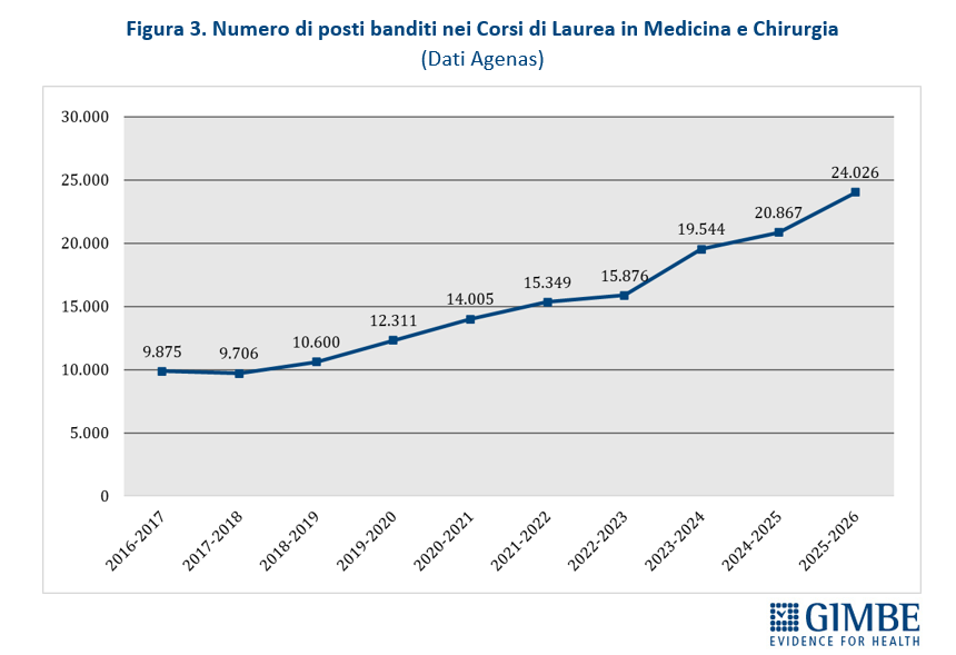 - Posti programmati. Negli ultimi 10 anni accademici sono stati programmati n. 152.159 posti nei Corsi di Laurea in Medicina e Chirurgia, con un trend in costante aumento. In particolare, negli ultimi 3 anni i posti a bando sono aumentati di oltre il 51% (da 15.876 a 24.026) e con la riforma Bernini nel 2025-2026 di ben 3.159 unità rispetto all’anno precedente (+ 15,1%) (figura 3).