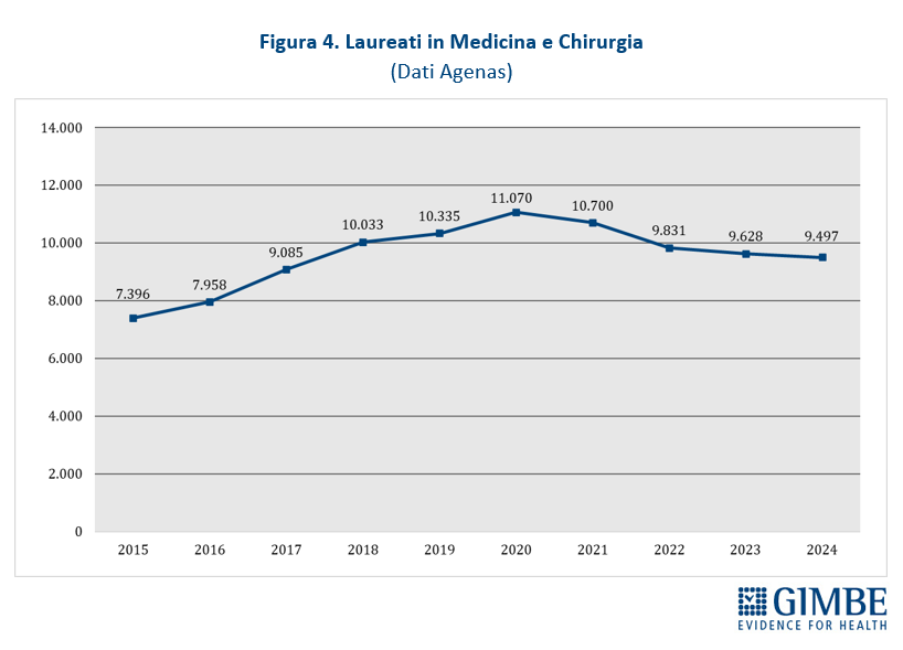 - Laureati. Dal 2015 al 2024 in Italia si sono laureati in Medicina e Chirurgia n. 95.533 studenti, con un trend in crescita: dai 7.396 del 2015 ai 9.497 del 2024 (figura 4). La media annua di laureati è aumentata da 8.961 del periodo 2015-2019 a 10.145 del 2020-2024.