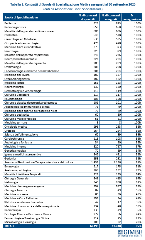 Carenze di medici nel SSN. «Il problema italiano – spiega Cartabellotta – non è rappresentato dalla mancanza di medici in termini assoluti, ma dal loro progressivo abbandono del SSN e da carenze selettive, perché sempre meno giovani scelgono la medicina generale e alcune specialità cruciali, ma poco attrattive». Per i medici di famiglia, sulla base dei dati SISAC, al 1° gennaio 2024 la Fondazione GIMBE stima una carenza di 5.575 MMG. Per i medici specialisti, la carenza può essere stimata solo analizzando i tassi di accettazione dei contratti di formazione specialistica. Nel concorso 2025-2026, a fronte di 14.493 contratti, ne sono stati assegnati 12.248 (85%), ma con tassi di assegnazione bassi o molto bassi in aree cruciali per il funzionamento del SSN: medicina d’emergenza-urgenza, chirurgia generale, medicina di comunità e delle cure primarie, radioterapia e tutte le specialità di laboratorio (tabella 2). «La soluzione per fronteggiare queste carenze selettive – chiosa Cartabellotta – non può certo essere quella di aumentare gli iscritti alle Facoltà di Medicina. Servono invece azioni mirate e interventi straordinari per restituire attrattività alla medicina generale e alle specialità disertate dai giovani medici».