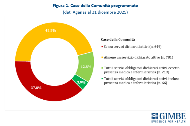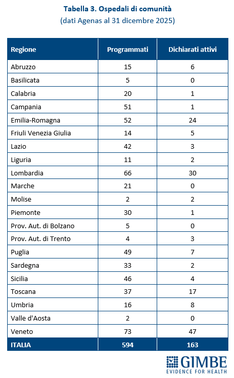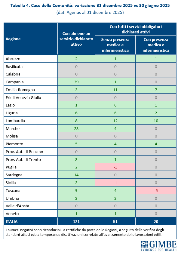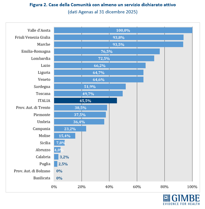 RIFORMA DELL’ASSISTENZA TERRITORIALE. A quattro anni dall’adozione del DM 77, la riforma dell’assistenza territoriale procede a rilento, con marcate diseguaglianze regionali, in particolare nell’attivazione e nella piena operatività di Case e Ospedali di Comunità. Lo confermano i dati elaborati dalla Fondazione GIMBE estratti dal report Agenas sul monitoraggio del DM 77, aggiornati al 31 dicembre 2025. «Il potenziamento dell’assistenza territoriale – afferma Cartabellotta – è la chiave per decongestionare ospedali e pronto soccorso e garantire una sanità di prossimità. Tuttavia, i dati ufficiali trasmessi dalle Regioni restituiscono un quadro preoccupante: fatta eccezione per le Centrali Operative Territoriali, a pochi mesi dalla scadenza del PNRR siamo molto lontani dal raggiungimento del target europeo. E il ritmo di attivazione di Case e Ospedali di comunità rimane troppo lento.