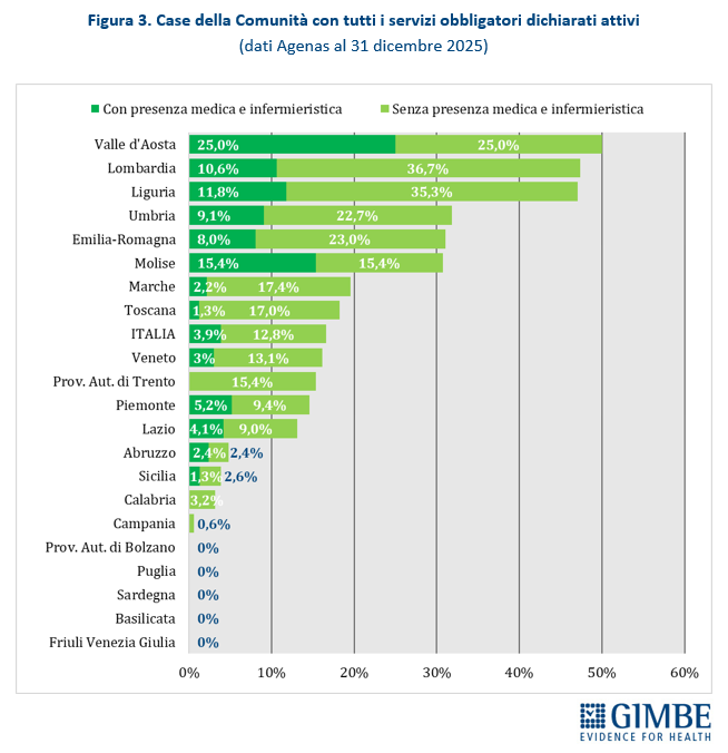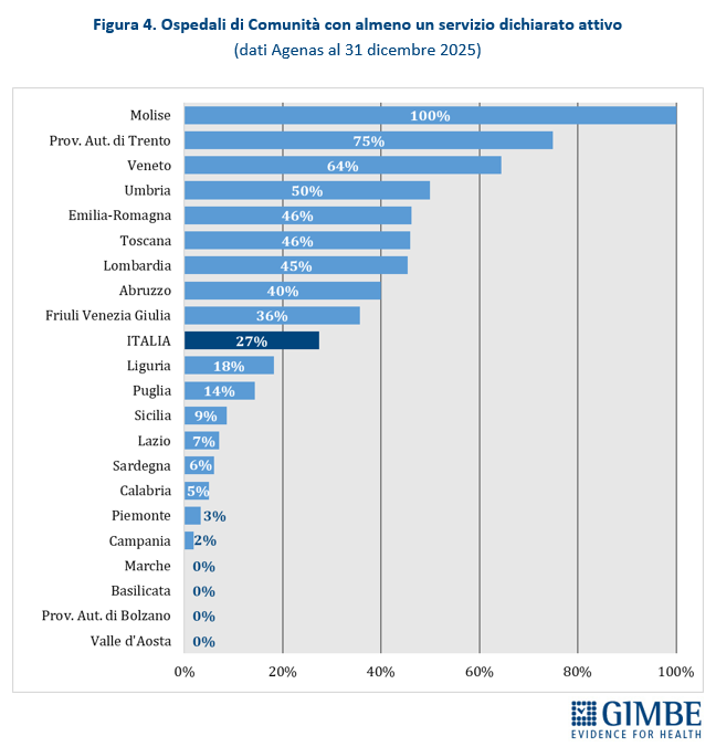 Ospedali di comunità. Al 31 dicembre 2025, dei 594 Ospedali di Comunità programmati, solo 163 (27,4%) risultano avere almeno un servizio attivo (Tabella 3), per un totale di oltre 2.900 posti letto. In valori assoluti, i numeri più alti si registrano in Veneto (n. 47), Lombardia (n. 30), Emilia-Romagna (n. 24) e Toscana (n. 17). Altre 13 Regioni hanno attivato almeno un OdC: dagli 8 dell’Umbria a 1 in Calabria, Campania e Piemonte. Quattro Regioni restano invece ferme a quota zero: Basilicata, Marche, Provincia autonoma di Bolzano e Valle d’Aosta. A fronte di una media nazionale del 27%, le differenze territoriali sono marcate: il Molise, con soli 2 OdC programmati, raggiunge il 100%, mentre all’estremo opposto quattro Regioni non ne hanno attivato alcuno; le altre si collocano in un intervallo molto ampio, dal 2% della Campania al 75% della Provincia autonoma di Trento (Figura 4). «Questi numeri – commenta Cartabellotta – certificano che sugli Ospedali di Comunità siamo ancora più indietro: non solo le strutture procedono a rilento, ma nessuna Regione è riuscita ad attivare tutti i servizi previsti dal DM 77. In queste condizioni, renderli “pienamente funzionanti” entro il 30 giugno appare una missione impossibile». Per essere pienamente operativi, gli OdC devono infatti garantire presenza medica per almeno 4,5 ore al giorno per 6 giorni su 7, assistenza infermieristica continuativa (H24 7/7 giorni), la figura del case manager, posti letto dedicati a pazienti con demenza o disturbi comportamentali e spazi per la riabilitazione motoria.