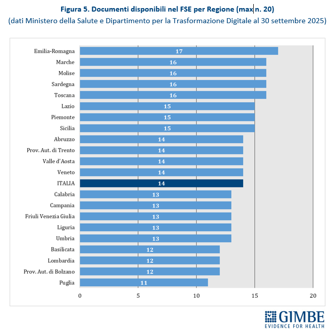 Completezza del FSE. Al 30 settembre 2025, secondo i dati del portale Fascicolo Sanitario Elettronico 2.0, nessuna Regione rende disponibili tutte le 20 tipologie di documenti previste dal DM 7 settembre 2023. Il livello di completezza varia dai 17 documenti dell’Emilia-Romagna agli 11 della Puglia (Figura 5).