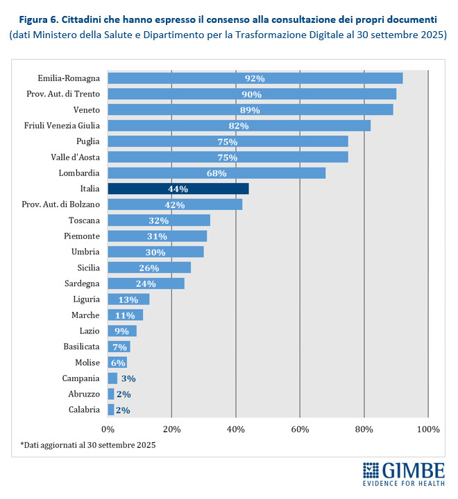 Consenso alla consultazione del FSE. Al 30 settembre 2025, solo il 44% dei cittadini ha espresso il consenso alla consultazione del FSE da parte di medici e operatori del SSN, con forti disomogeneità regionali: dal 2% in Abruzzo e Campania al 92% in Emilia-Romagna. Tra le Regioni del Mezzogiorno, solo la Puglia supera la media nazionale (44%), raggiungendo il 75% (Figura 6). «Se nemmeno la metà dei cittadini consente l’accesso al proprio FSE – avverte Cartabellotta – non siamo di fronte a un problema tecnico, ma a un fallimento culturale e organizzativo. Colmare divari così ampi richiede alla politica interventi immediati: nel Mezzogiorno pesano analfabetismo digitale, scarsa fiducia sulla sicurezza dei dati e una limitata percezione dell’utilità del FSE».