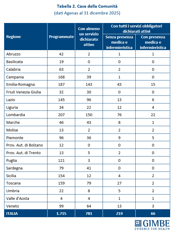 Case della Comunità. Al 31 dicembre 2025, su 1.715 CdC programmate, per 649 (37,8%) le Regioni non hanno dichiarato attivo alcun servizio previsto dal DM 77. «Per oltre un terzo delle strutture programmate – commenta il Presidente – non esiste alcun dato pubblico: né sulla loro reale esistenza, né sullo stato di avanzamento». Per 781 strutture (45,5%) risulta attivo almeno un servizio: di queste solo per 285 (16,7%) sono stati dichiarati attivi tutti i servizi obbligatori: presenza di équipe multi-professionali, punto unico di accesso, assistenza domiciliare, specialistica ambulatoriale, servizi infermieristici, sistema di prenotazione collegato al CUP, integrazione con i servizi sociali, partecipazione della comunità, oltre a servizi diagnostici di base, continuità assistenziale e punto prelievi solo nelle CdC principali (hub). «Considerata la rilevanza di ciascuno di questi servizi – chiosa Cartabellotta – la loro presenza parziale non solo indebolisce le funzioni delle Case della Comunità, ma rende le strutture poco attrattive per i cittadini che non trovano tutte le risposte adeguate ai bisogni assistenziali». Infine, delle 285 CdC con tutti i servizi obbligatori attivi, solo 66 (3,9%) risultano pienamente operative, grazie alla presenza di personale medico (H 24 7/7 giorni nelle CdC principali e almeno 12 ore/die per 6/7 giorni nelle secondarie) e infermieristico (almeno 12 ore/die per 7/7 giorni nelle CdC principali e per 6/7 giorni in quelle secondarie) (Figura 1, Tabella 2).